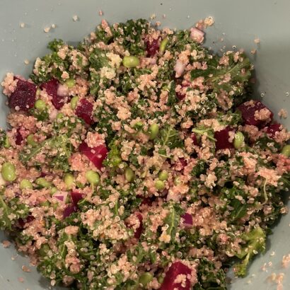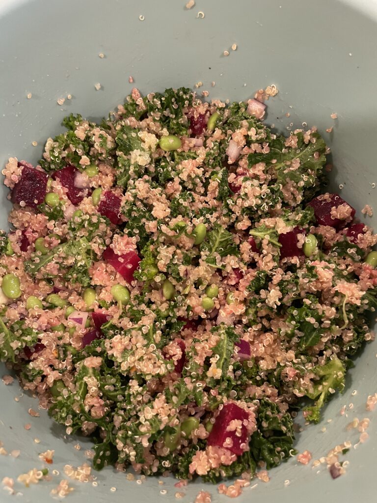 - In a large bowl add red onion, beets, kale, edamame and quinoa. Toss with more dressing and combine well.